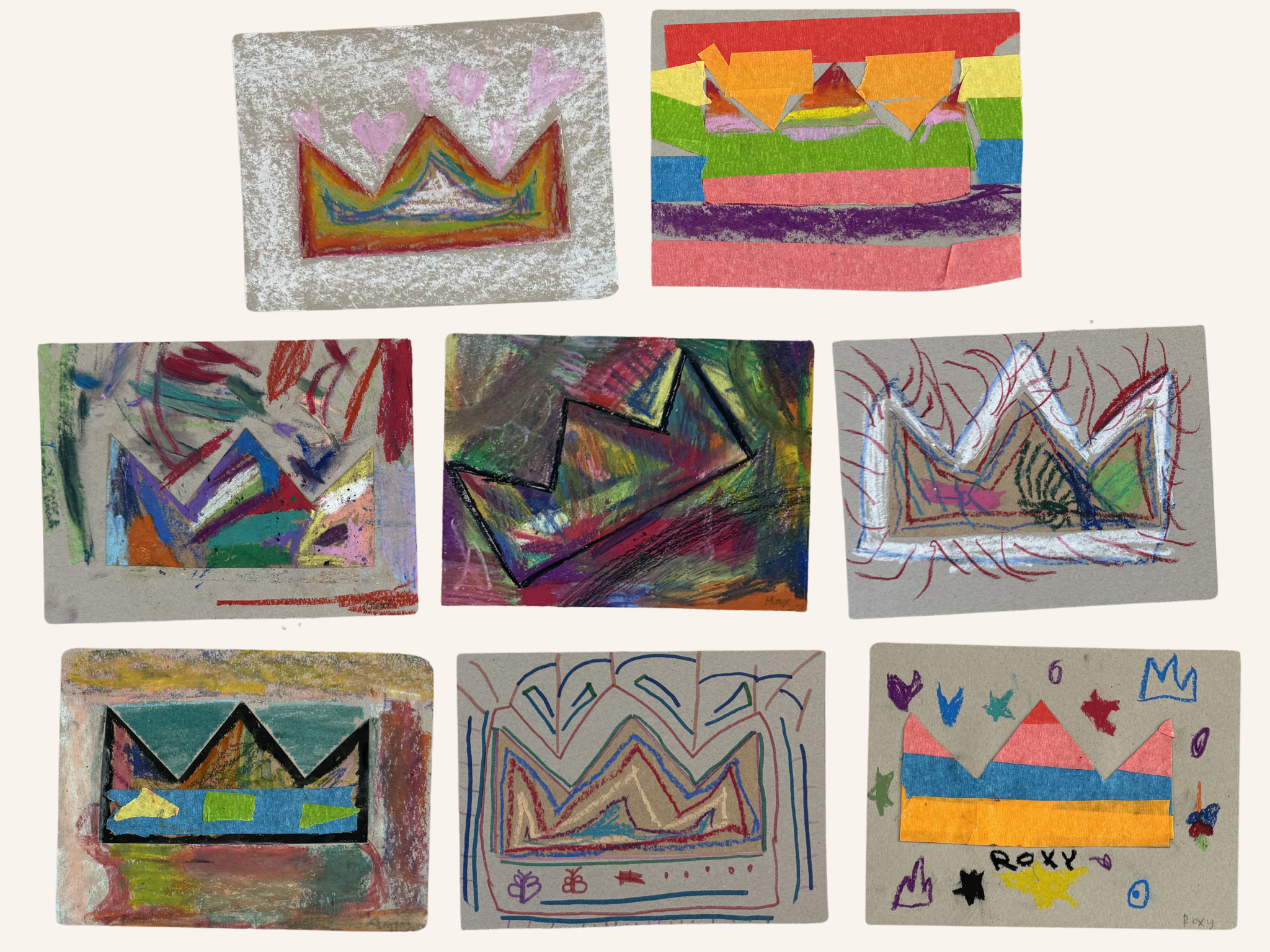 We had so much fun with this prompt. We brought in precut crowns and had the kiddos got busy decorating them. Some used the tape first, creating lines and shapes that they’d color in. Others made colorful, opaque marks with the oil pastels over their entire crown.